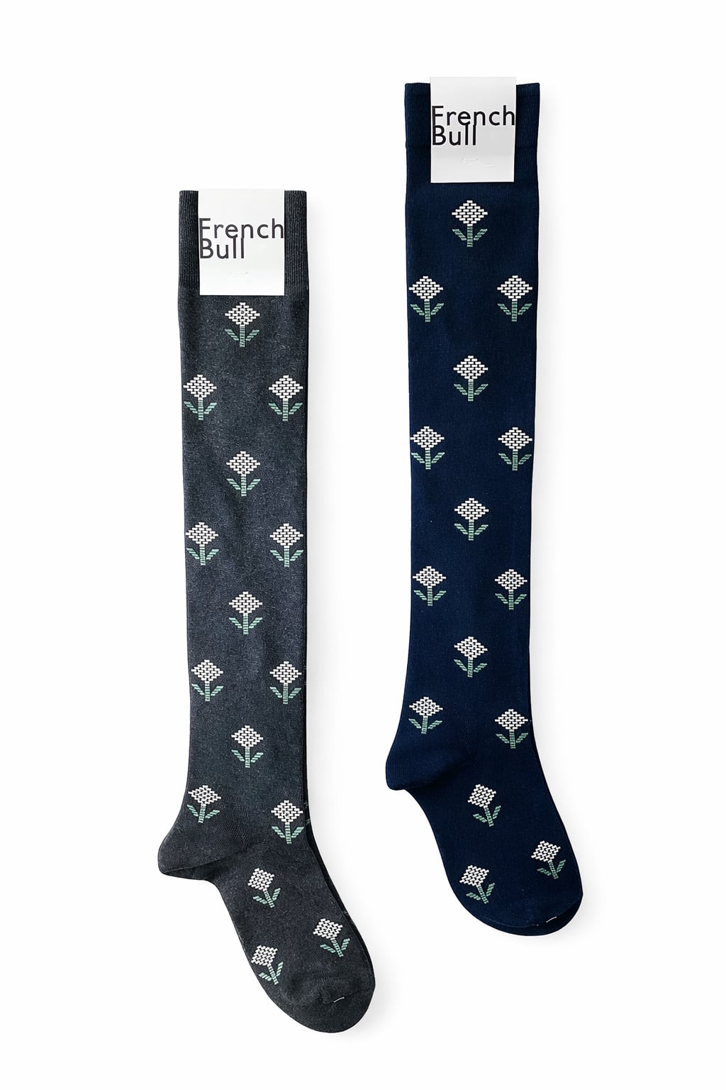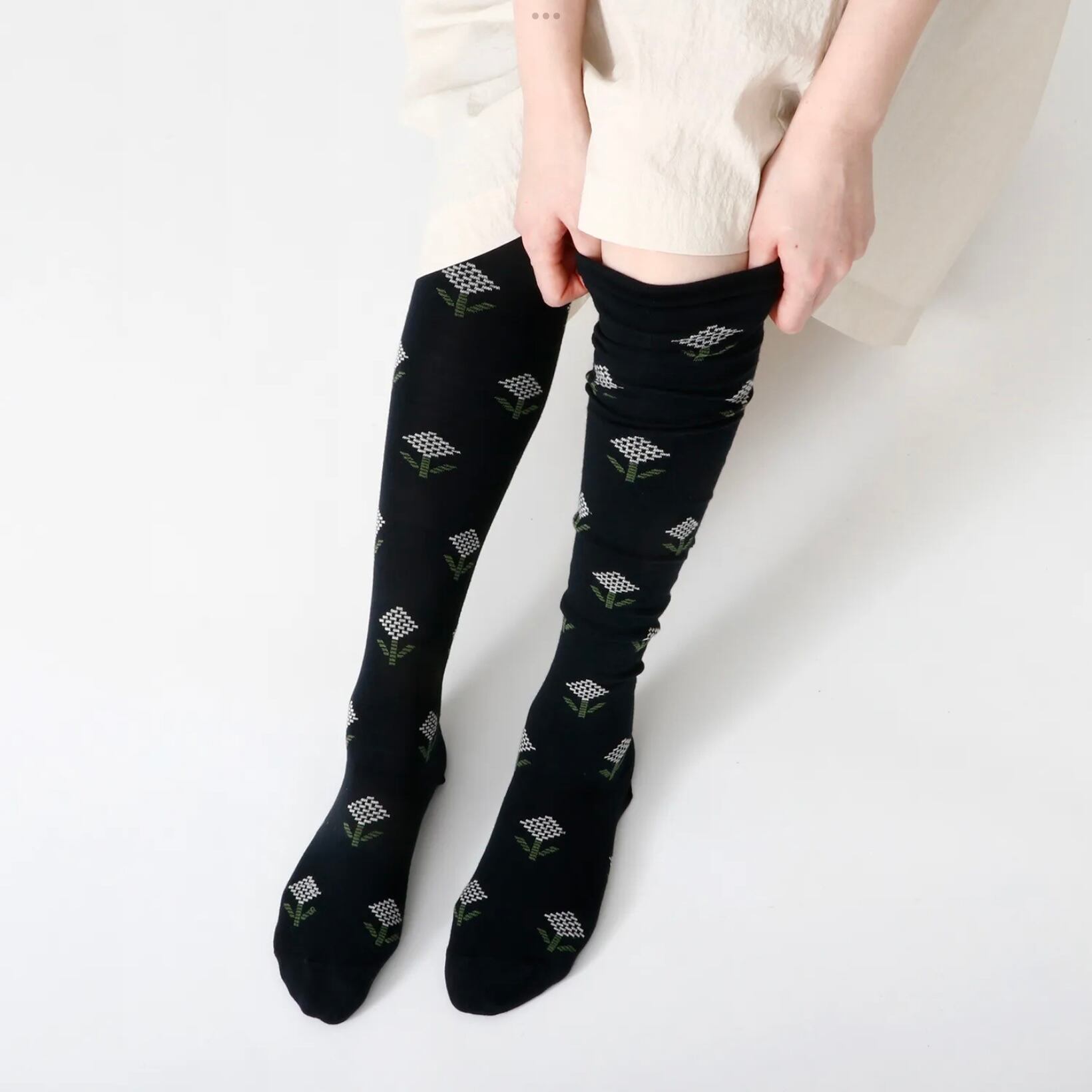 点描で表現したお花を散りばめた柄のロング丈のハイソックスです。