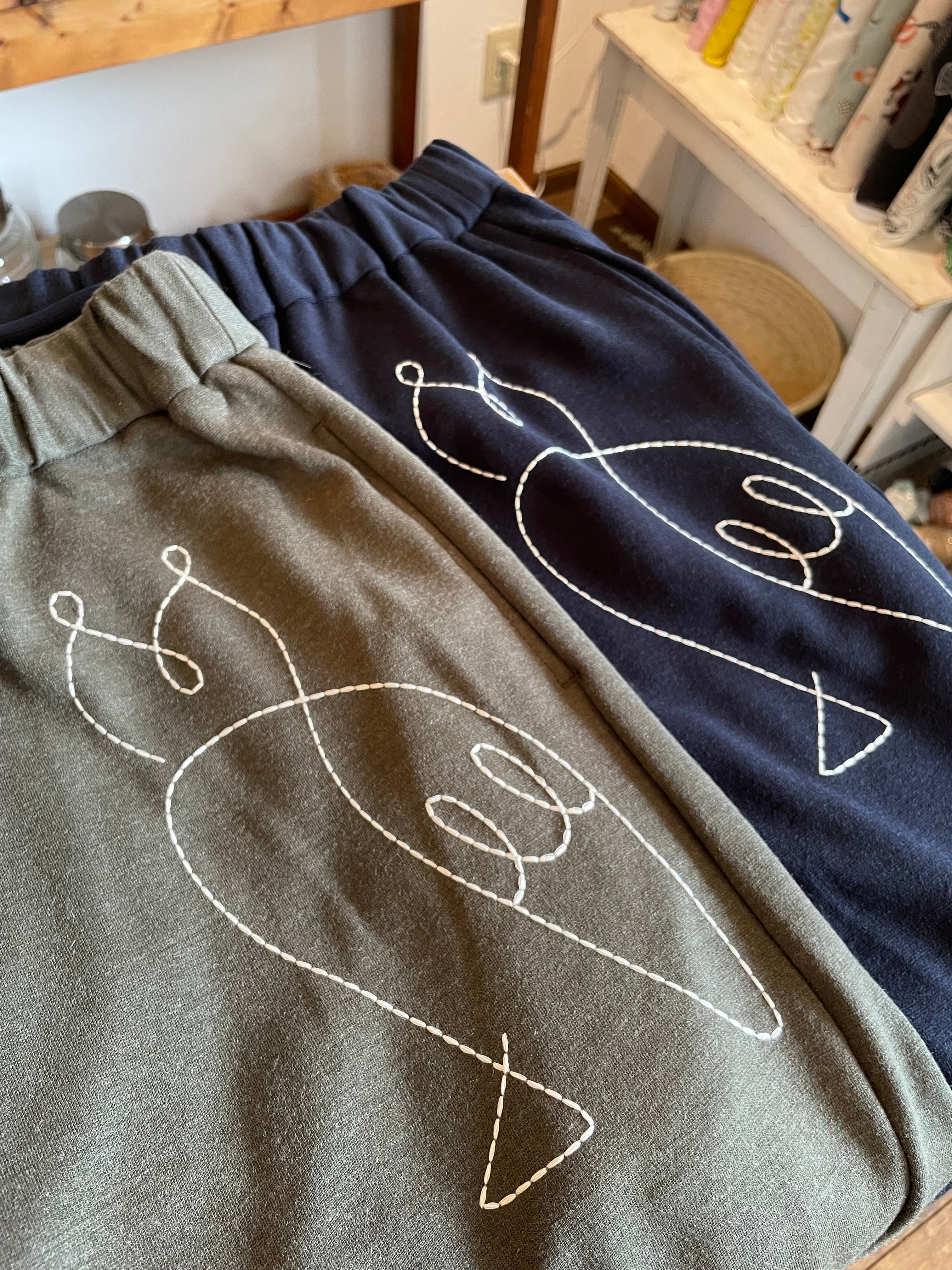 ポッケに一筆書きのフクロウをハンドステッチ風の刺繍で描かれています。