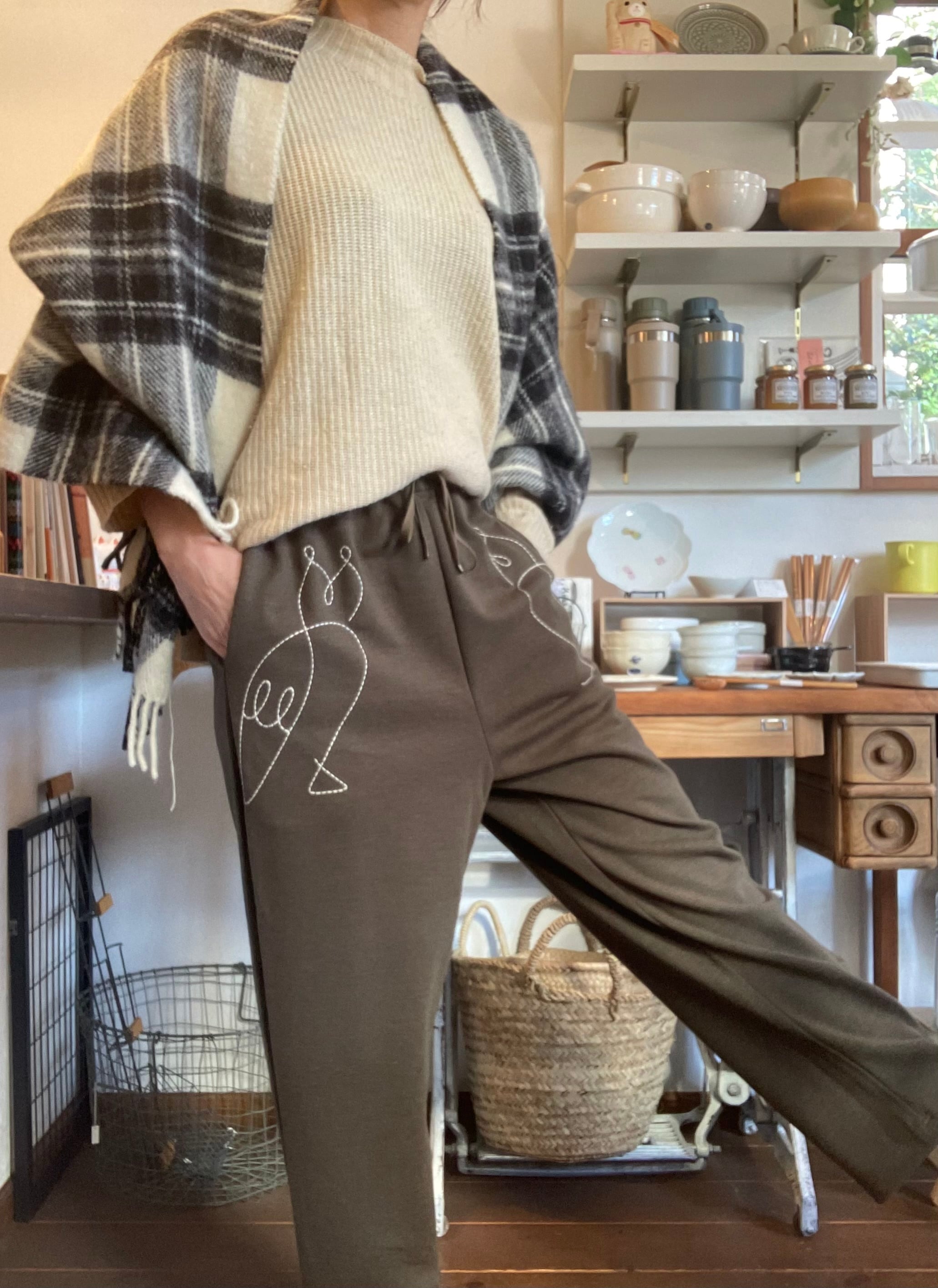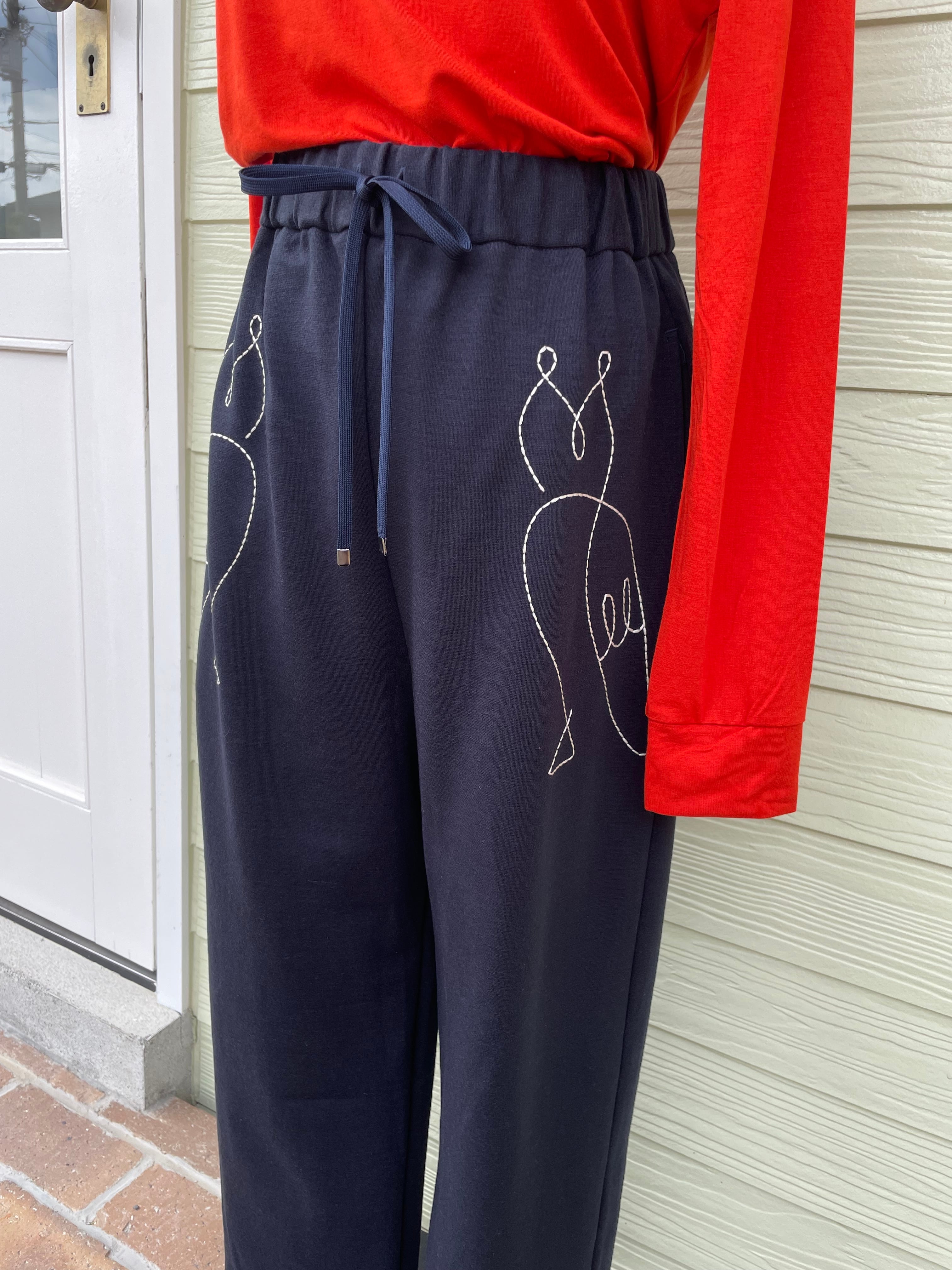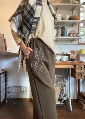 ポケット部分に対になるように描かれた2羽のフクロウがポイントのパンツ。